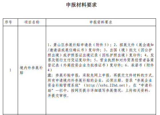 (二)申報(bào)材料應(yīng)明確反映補(bǔ)貼依據(jù),如申報(bào)境內(nèi)外參展補(bǔ)貼的,材料應(yīng)明示展位數(shù)量和展位費(fèi)金額。